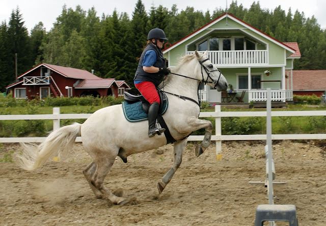 Tänä tiistaina siis päästiin vihdoin viimein hyppäämään myös Veltsun kanssa. Kerran hypättiin tallin kisoissa tätä ennen, samana päivänä kun lähdettiin risteilylle Visbyyn, Gotlantiin. Ihan järjettömän lätäkköisellä kentällä, kun melkein koko viikon oli satanut. Ja kisapäivänäkin satoi. Peruin jälkimmäisen luokkani ja hyppäsin vain 70cm, kun en muuten olisi ehtinyt hoitaa varusteita pois ennen risteilylle lähtöä. Vellon kanssa on ennenkin hypätty pienessä sateessa, mutta ei noin märällä kentällä eikä noin kovassa sateessa, kun valkut on aina silloin peruttu. Vähän se katseli lätäköitä, mutta otin lähdön suoraan lätäkön läpi, jotta siitä laukkaaminen ei sitten radalla olisi outoa. En ratsastanut aikaa, mutta sen verran oioin päädyissä, etten mennyt samoja jälkiä kuin suurin osa muista oli mennyt. Kaikki meni kivasti ensimmäisen vaiheen viimeiselle esteelle, jolla Vello puski koko ajan kovasti vasemmalle. Sain pidettyä esteen edessä, mutta juuri ennen estettä Vello teki rajun väistöliikkeen oikealle, jolloin horjahdin vähän tasapainosta, mistä Vello järkyttyi ja teki vielä isomman ryntäyksen. Tämän seurauksena mä tipahdin vasemmalle ja tulin suoraan maha edellä kannatinta päin. Illalla hytissä huomasinkin, että mun mahassa oli valtaisa mustelma, vaikka mahaan ei kauan tippumisen jälkeen sattunutkaan. Vello juoksenteli pienen pätkän, mutta meni nopeasti aidan vierelle kattelemaan ihmisiä (mielellään aina kisoissa pysähtyis ihmisten luokse aidan reunalle) ja saatiin nopeasti kiinni. Takaisin selkään järkyn hiekkaisilla housuilla (lisää satulan pesua, jee..) ja vielä hyppy sen viimeisen esteen yli, tällä kertaa siis yli asti, vaikkakin pienellä kyttäyksellä. En oikein tiedä mikä siellä esteen takana pelotti, kun ei se lätäkkökään niin pahasti sieltä näkynyt kuin yhden toiseen esteen takana, mutta tuohon esteelle oli useampikin sinä päivänä pysähtynyt. No, tulipahan kokeiltua todella märällä kentällä hyppäämistä, kisoista kun ei koskaan tiedä mitä tulee eteen..